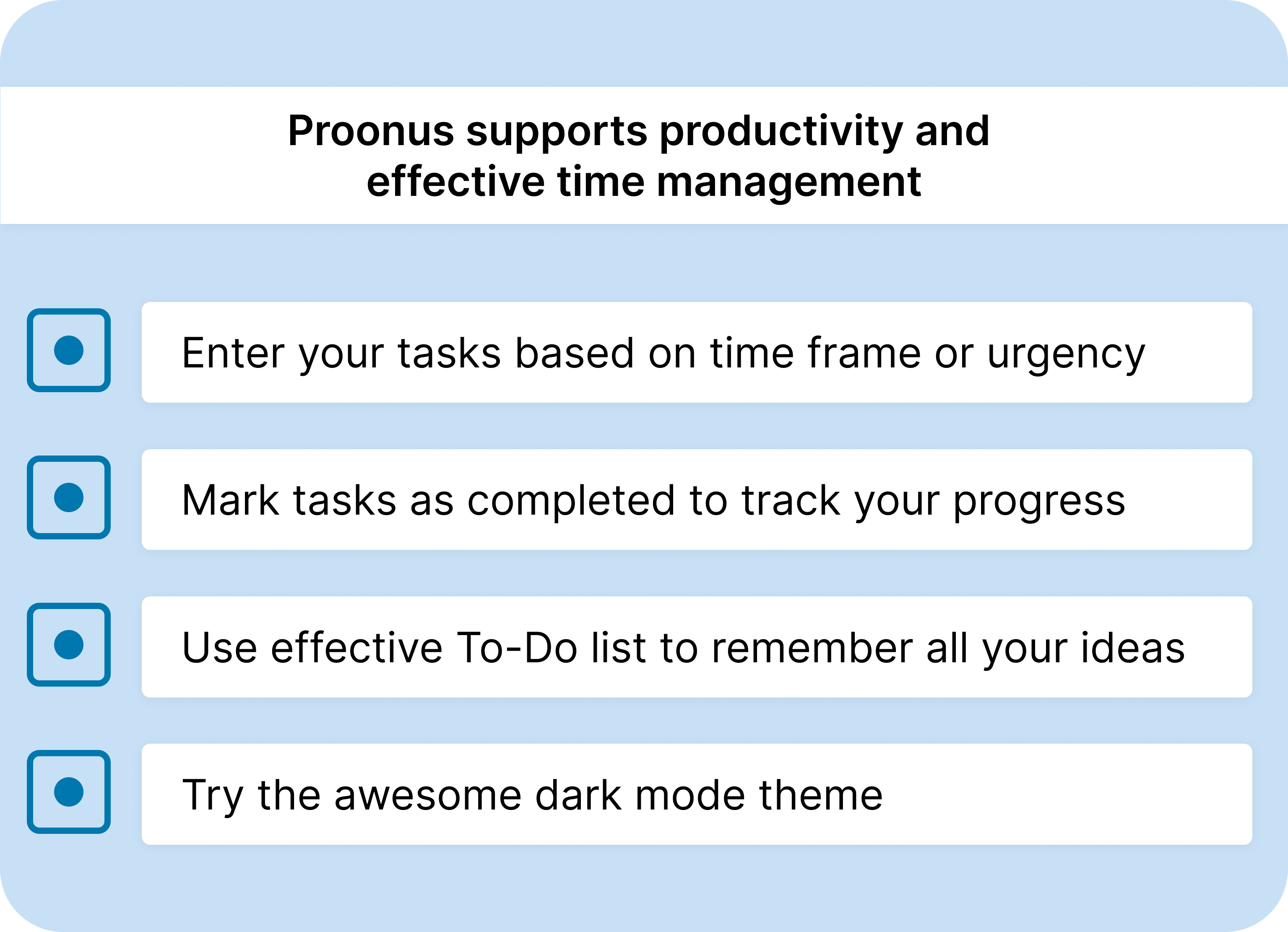 Proonus is a task planner that supports effective allocation of tasks. Based on a methodology that aims to improve focus, productivity and completion of daily tasks.
